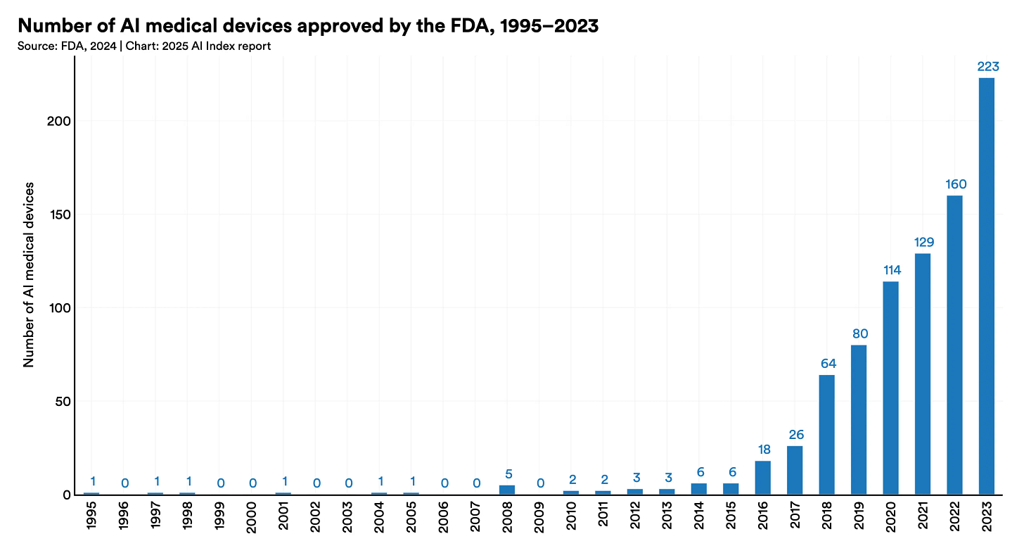 Da saúde ao transporte, a inteligência artificial está rapidamente saindo dos laboratórios e se integrando ao dia a dia. Em 2023, a FDA (agência reguladora dos EUA) aprovou 223 dispositivos médicos com IA, um salto significativo em relação aos apenas seis aprovados em 2015. Nas ruas, os carros autônomos já deixaram de ser apenas testes: a Waymo, uma das maiores operadoras dos EUA, realiza mais de 150 mil corridas autônomas por semana, enquanto a frota acessível de robotáxis Apollo Go, da Baidu, já atende diversas cidades na China.