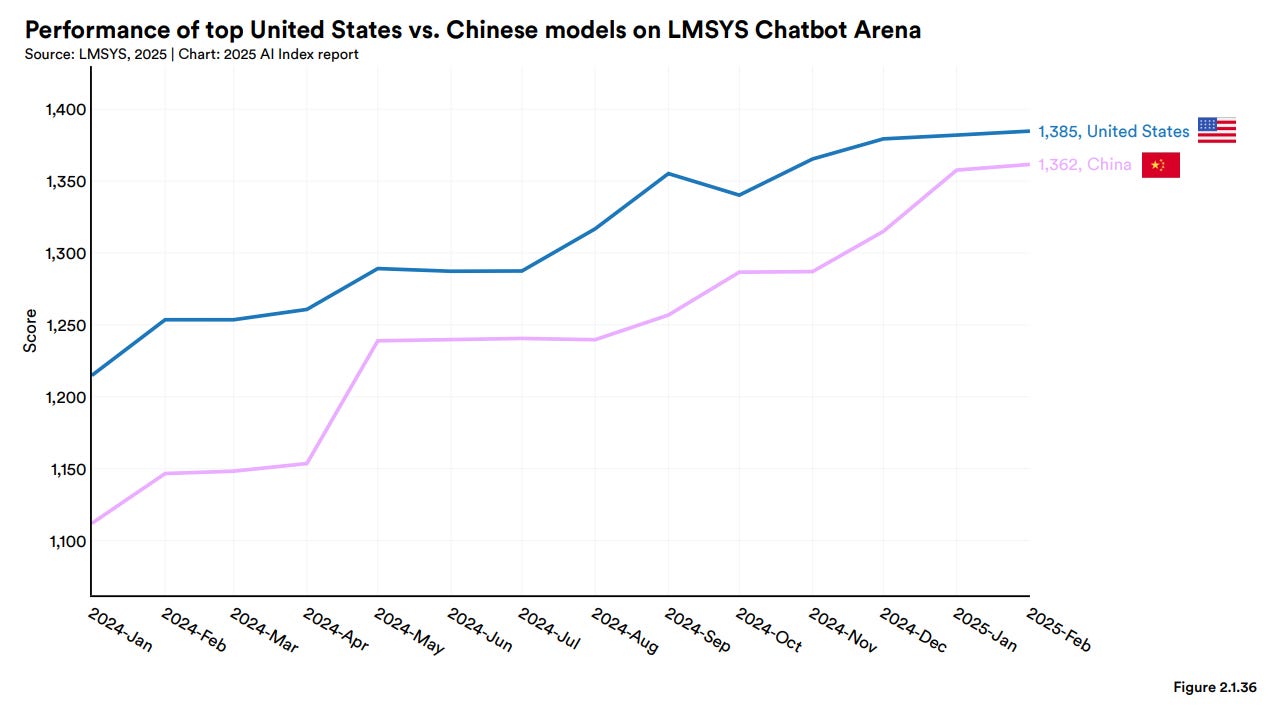 Segundo o relatório mais recente do Stanford AI Index, a China reduziu drasticamente a diferença de qualidade entre seus modelos de IA e os dos EUA. Em 2023, ainda havia uma diferença de dois dígitos entre os melhores modelos dos dois países. Agora, os modelos chineses alcançaram pontuações semelhantes em dois dos principais benchmarks de desempenho. Isso é especialmente impressionante considerando que as startups americanas receberam quase 12 vezes mais investimentos.