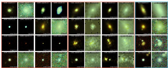Exemplos de imagens de galáxias que foram geradas, comparadas às imagens reais.